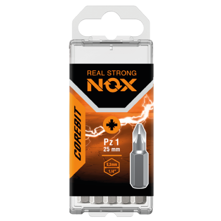 NOX COREBIT. Классические биты с высоким ресурсом; Сталь не сырая (S2), Правильная геометрия наконечника, Бюджетная цена Высококачественная бита Nox Corebit Long предназначена для работы с шуруповертами при монтаже/демонтаже крепежа. Изготовлена из легированной композитной стали стандарта ANSI S2. Это специальная комплексно-легированная сталь с повышенным содержанием углерода, которую можно отнести к группе инструментальных сталей. Твердость: 58-62 HRC Биты NOX изготовлены методом фрезеровки , что обеспечивает точность формы биты в соответствии со стандартом DIN и гарантирует высокий ресурс биты. Подходит для работы электродрелью со стандартным трёхкулачковым зажимным патроном и шуруповёртом с шестигранным патроном для быстрой смены насадки. Термическая обработка с использованием лазерного излучения позволяет сформировать тонкий поверхностный слой металла, имеющего определённую структуру, с целью получения высокой износостойкости поверхности без коробления подложки и негативного влияния на определённые желаемые свойства основного металла – такие, как пластичность или прочность.