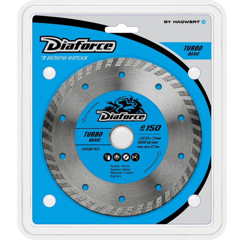 Алмазные диски Dia for ce Basi c предназначены для резки бетона, натурального и искусственного камня, кирпича, а так же чистого реза керамических изделий, в том числе твердого керамогранита и всех видов керамической плитки. Линейка алмазных дисков бюджетного сегмента, с меньшей высотой алмазной кромки, по сравнению со старшей линейкой DIAFORCE, для эпизодических работ небольших объемов. Диск алмазный отрезной со сплошной ребристой кромкой для работы по бетону. ОБРАБАТЫВАЕМЫЕ МАТЕРИАЛЫ: • Армированный бетон • Камень тверд. • Мрамор / гранит • Кирпич