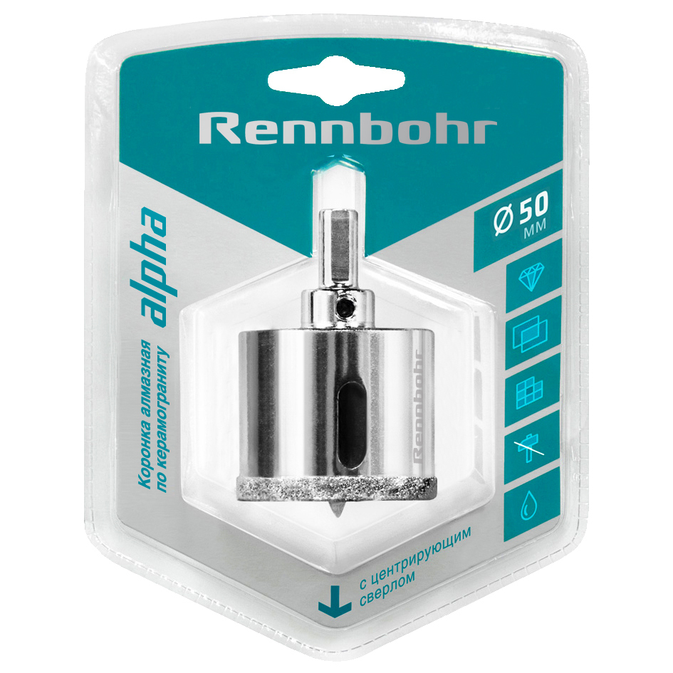 Коронка алмазная с центрирующим сверлом по керамограниту и керамике 50мм "Rennbohr"