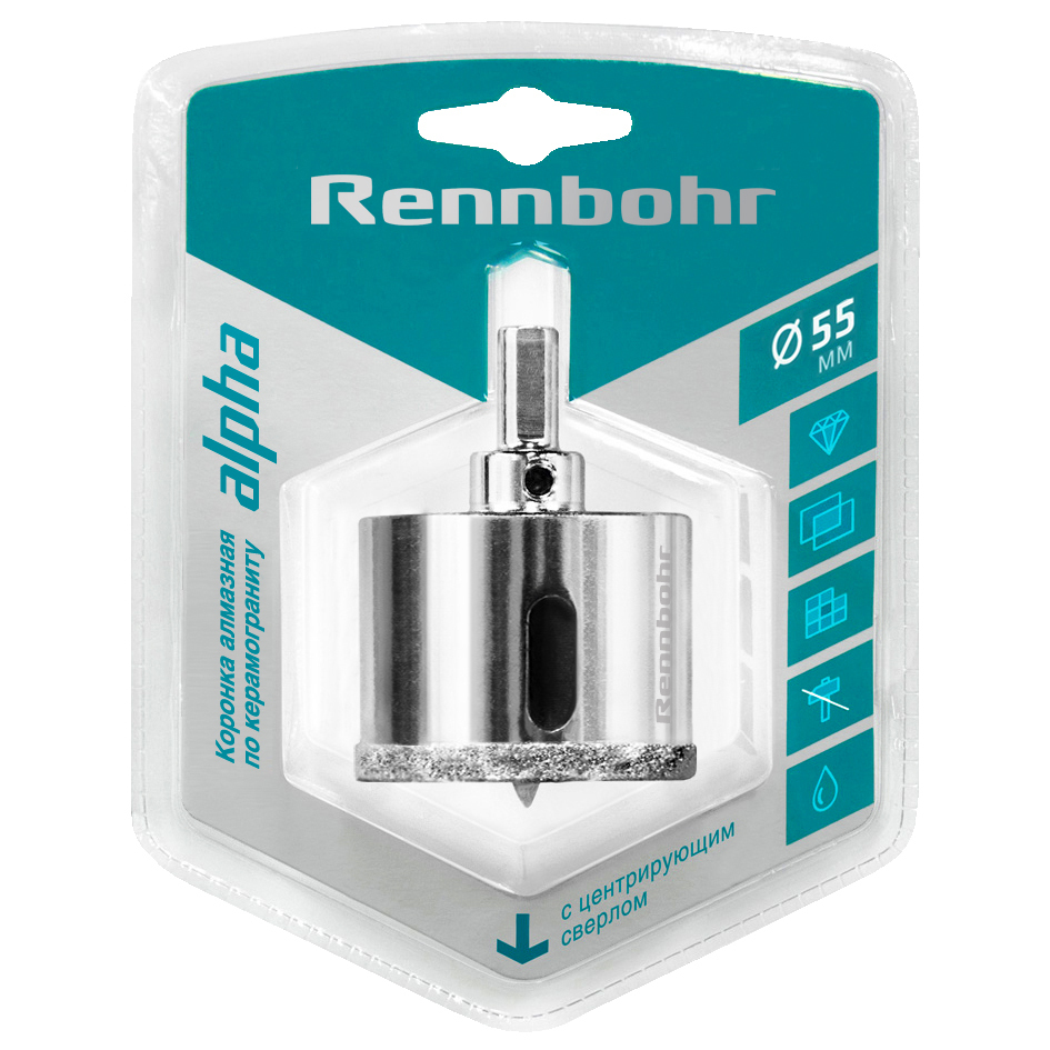 Коронка алмазная с центрирующим сверлом по керамограниту и керамике 55мм "Rennbohr"