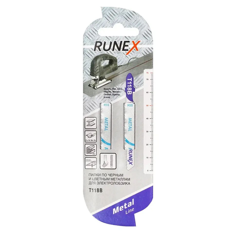 Полотна RUNEX - высокая износостойкость, стабильное, постоянно контролируемое качество. Торговая марка Runex известна высоким качеством и широким ассортиментом выпускаемой продукции. Пилки для электролобзика Runex отличаются специальной закалкой металла и острыми зубьями с оптимальным углом наклона, что позволяет добиться желаемого результата быстро и с минимальными усилиями. Они подходят для использования с электролобзиками многих известных марок: Bosch, Skil, Kress, Hitachi, Metabo, Dewalt, Sparky, AEG.