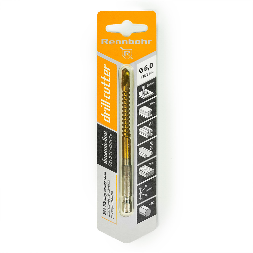 СВЕРЛО-ФРЕЗА HAGWERT изготовлено из износостойкой быстрорежущей стали P6M5 / HSS-TIN. Поверхность имеет титановое напыление, для повышения стойкости режущих кромок. Предназначено для просверливания и рассверливания отверстий на произвольный больший диаметр. Для работ по стали, жести, дереву, пластику, гипсокартону.
